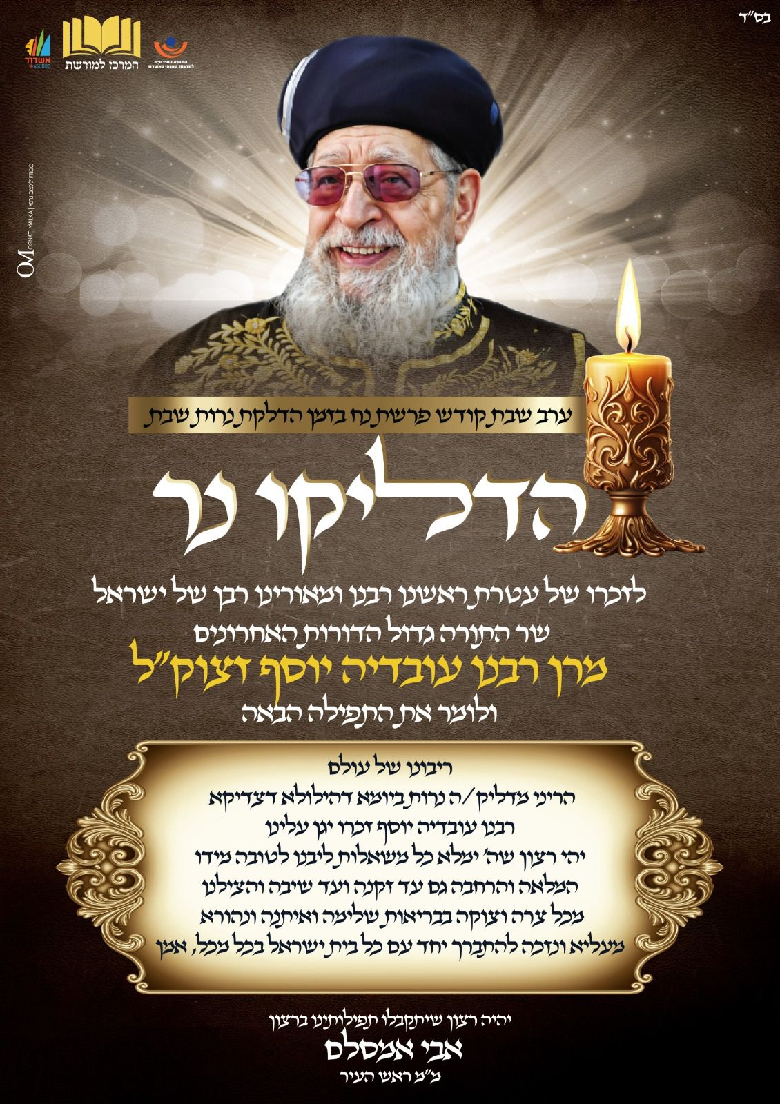 במלאת 12 שנה להסתלקותו של אביר הרועים, מגדולי הדורות האחרונים מרן רבינו עובדיה יוסף זצוק"ל, מורה דרכה הרוחנית של יהדות ספרד המעטירה, בעל ה'יביע אומר' ו'חזון עובדיה' ונשיא מועצת חכמי התורה - 'המרכז למורשת' בראשות מ"מ ראש העיר ויו"ר שס הרב אבי אמסלם יוצא בשורת מיזמי הנצחה לזכרו הגדול.