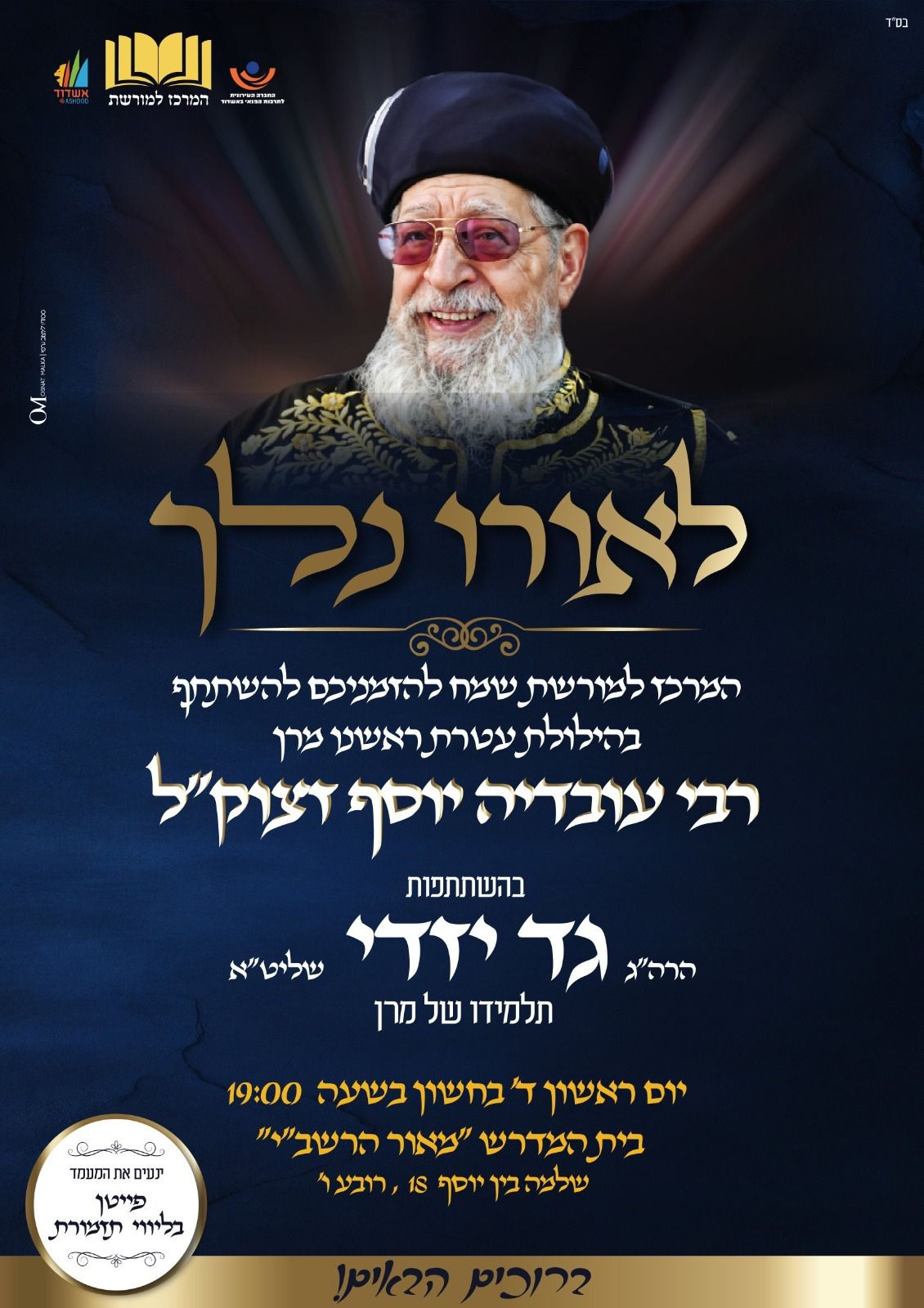 אמש התקיימה עצרת התעוררות בהשתתפות מאות בהיכל ישיבת 'זוהר התורה' במעמד בנו הראשל"צ והרב הראשי לישראל הגה"ג רבי דוד יוסף שליט"א בעל ה'הלכה ברורה', ובנוכחות מקים עולה של תורה בעיר אשדוד הגאון הגדול רבי מאיר מויאל שליט"א, חתנו של מרן זיע"א הגה"ג רבי מרדכי טולידאנו שליט"א ומ"מ ראש העיר ויו"ר שס אשדוד הרב אבי אמסלם הי"ו. כמו"כ ביום א' תתקיים הילולא לזכרו בבית המדרש מאור הרשב"י ברובע ו' עם תלמיד מרן הרב גד יזדי,