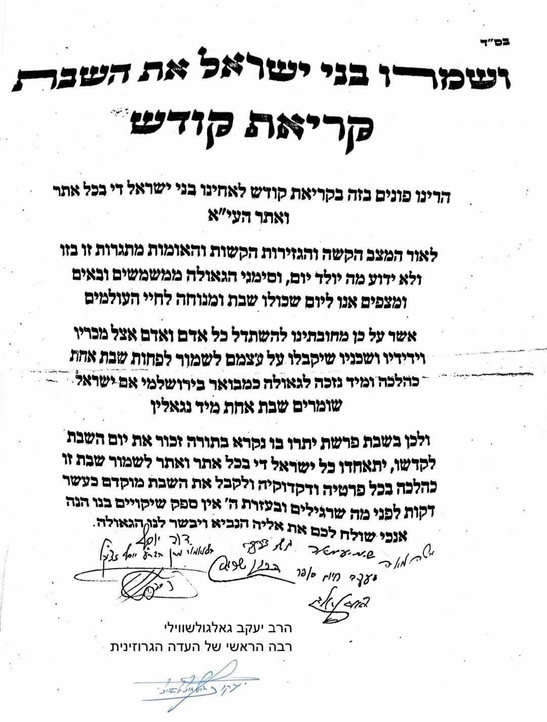 רבה של גיאורגיה וחבר לשכת הרבנות באשדוד הגר"י גאגולאשוילי בקריאת קודש לחיזוק ושמירת השבת בהתאחדות עם ישראל לשבת זו פרשת יתרו